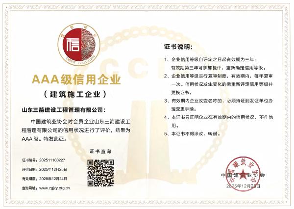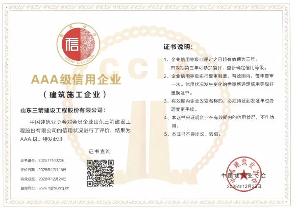 近日,中国建筑业协会正式发布2025年度会员AAA级信用企业名单,山东三箭集团旗下三箭建设股份公司、三箭建设管理公司、三箭劳务公司同时入选,获评三项中国建筑业协会“AAA级信用企业”称号。该结果标志着山东三箭集团整体信用体系建设取得显著成效,获得了国家行业权威机构的高度认可。
